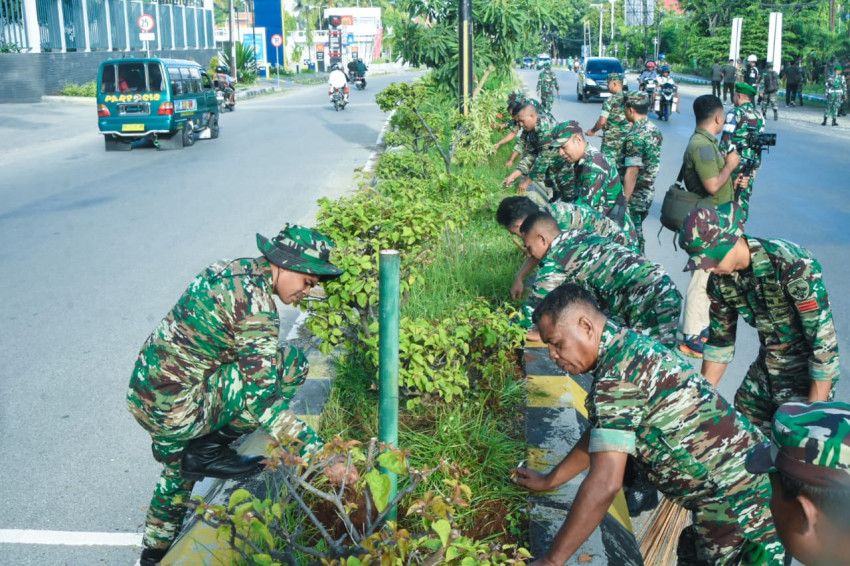 Halaman ini kita melaksanakan kegiatan bersih- bersih di Kota dalam rangka menyambut HUT Korem 161 Wira Sakti ke 63. Seperti kita ketahui bahwa Panglima TNI sudah sampaikan kepada kita tentang PRIMA (Profesional, Responsif, Integratif Modern dan Adaptif), selanjutnya bapak Kasad sampaikan kepada kita : TNI AD bersama dengan rakyat bersatu dengan alam untuk NKRI.Kita tahu bahwa Tuhan menciptakan alam begitu indah, hidup kita memelihara, maka dengan konsep-konsep besar dari pemimpin TNI, kita harus mulai dari hal-hal kecil dari sekarang, kita harus berubah , minimal kota kita harus bersih,mata kita sehat,” jelas Danrem 161/Wira Sakti.